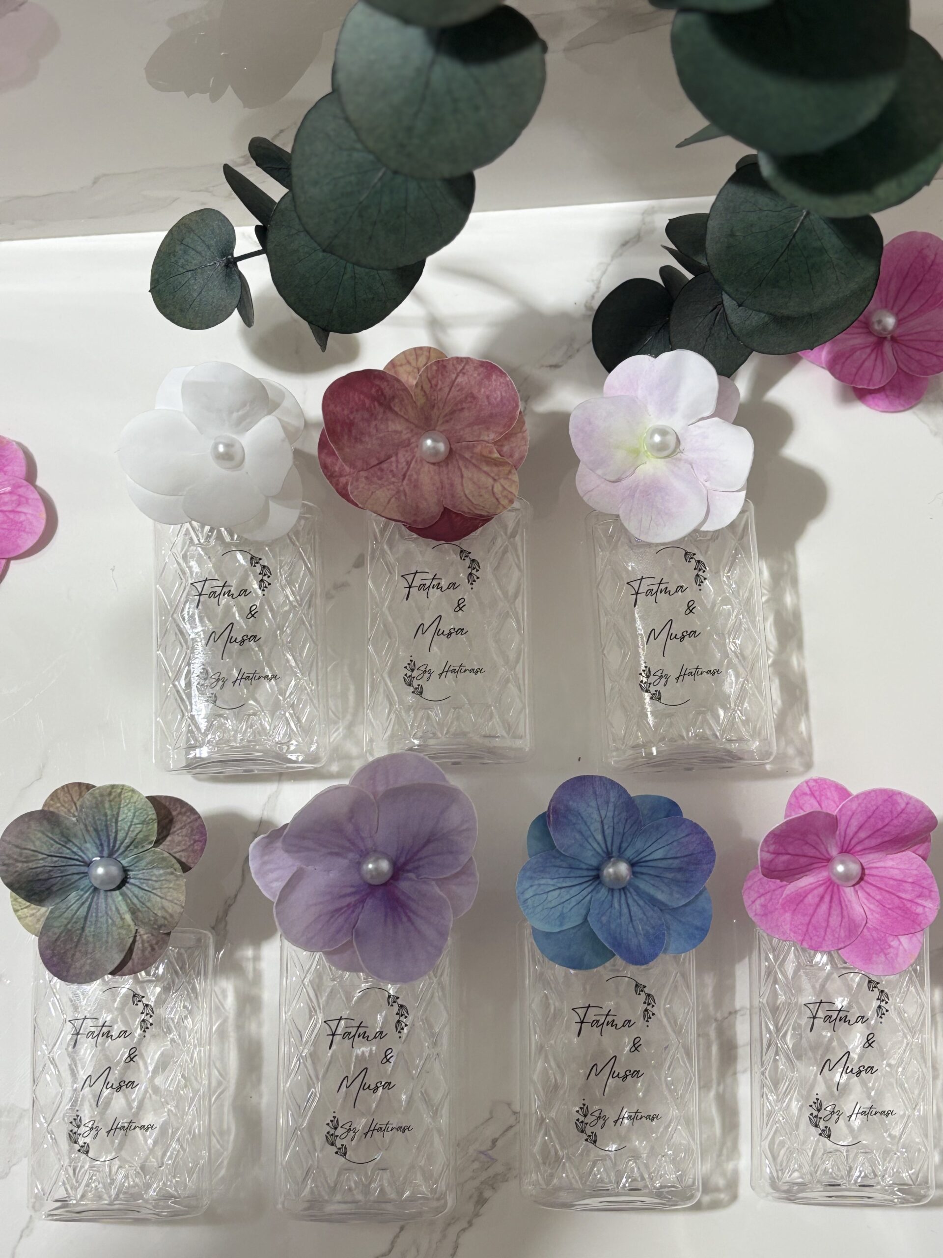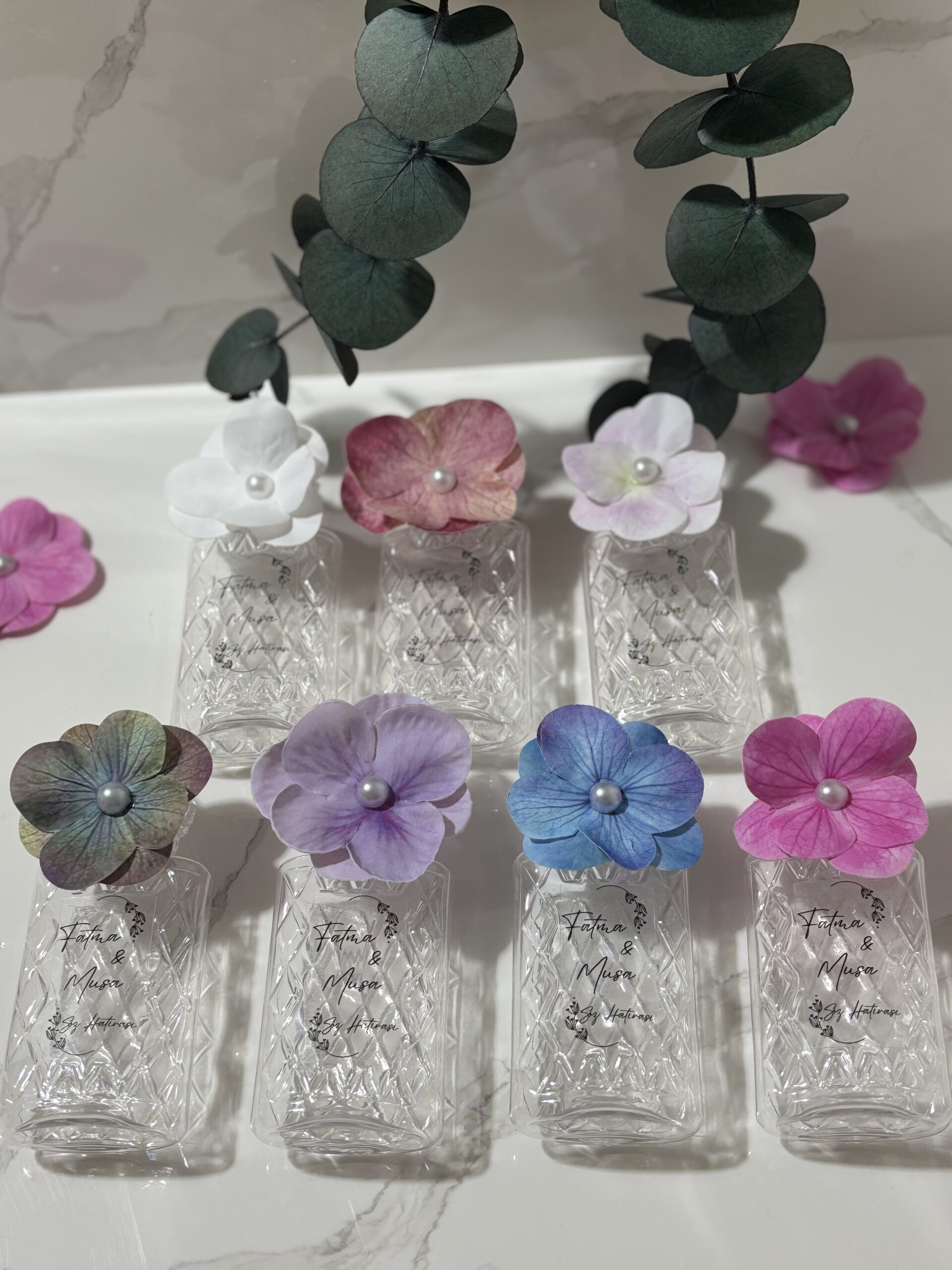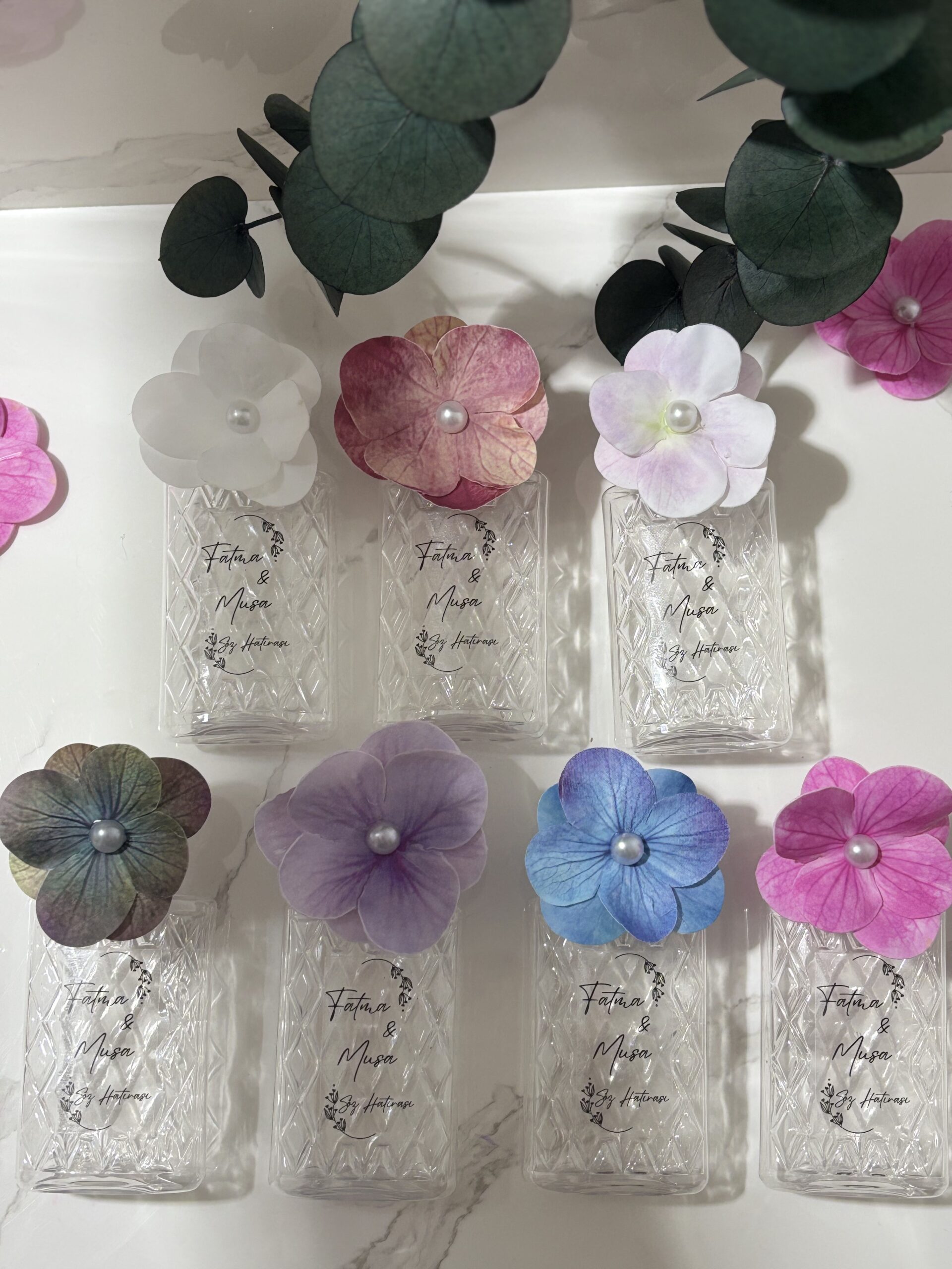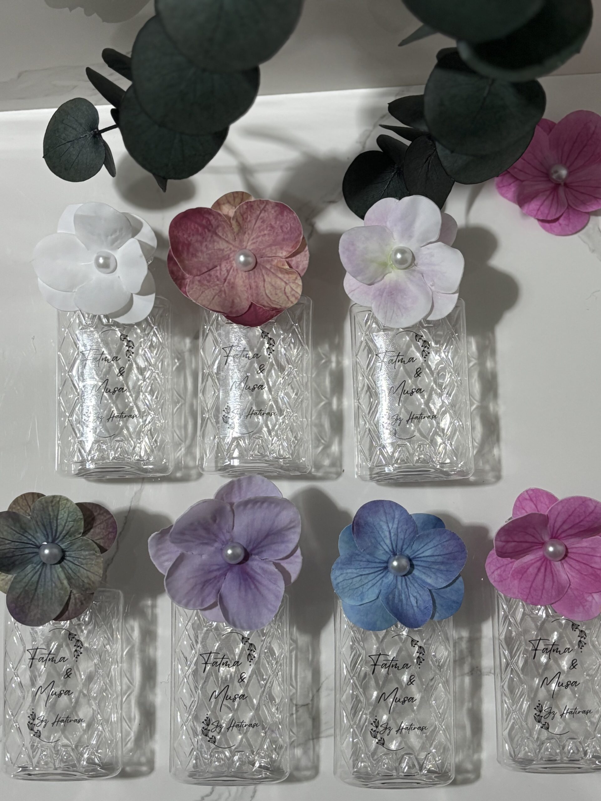 Ortanca çiçeği süslemesi ve desenli tasarımıyla öne çıkan 50cc mika şişe, özel günlerinize estetik bir dokunuş katar. Kolonya, esans, gül suyu ve benzeri sıvı kullanımına uygundur.