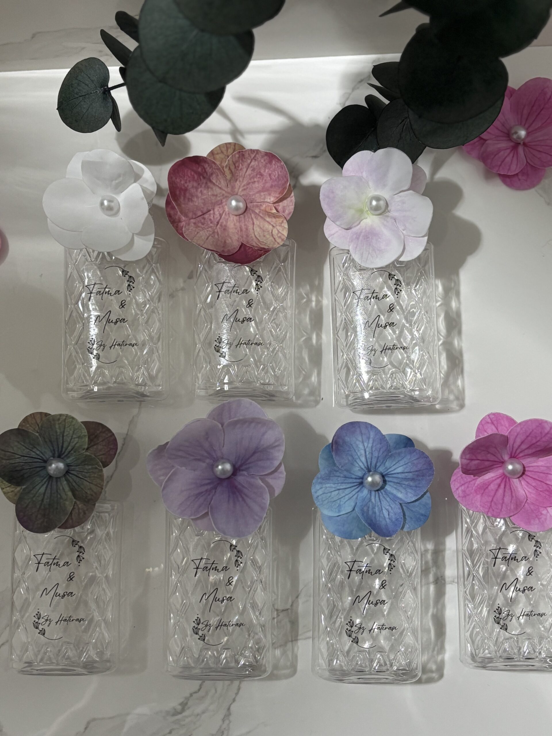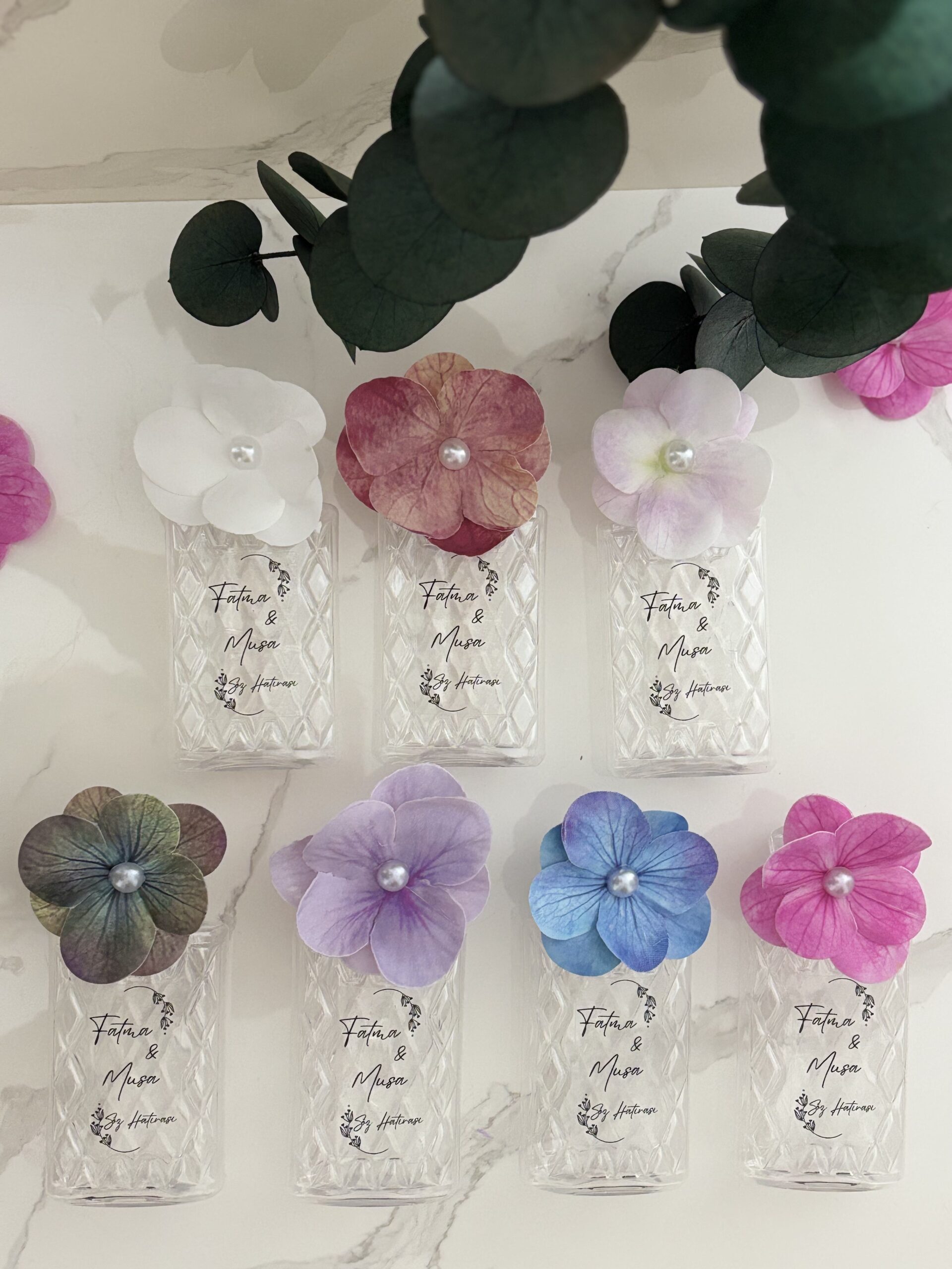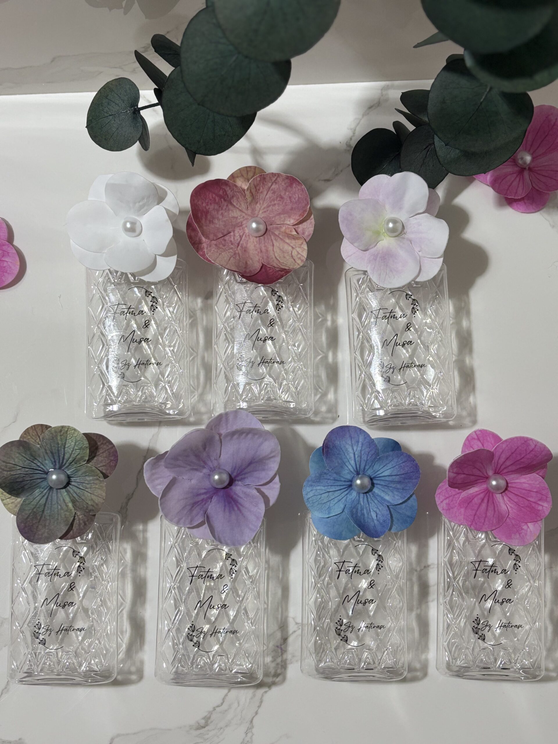 Ortanca çiçeği süslemesi ve desenli tasarımıyla öne çıkan 50cc mika şişe, özel günlerinize estetik bir dokunuş katar. Kolonya, esans, gül suyu ve benzeri sıvı kullanımına uygundur.