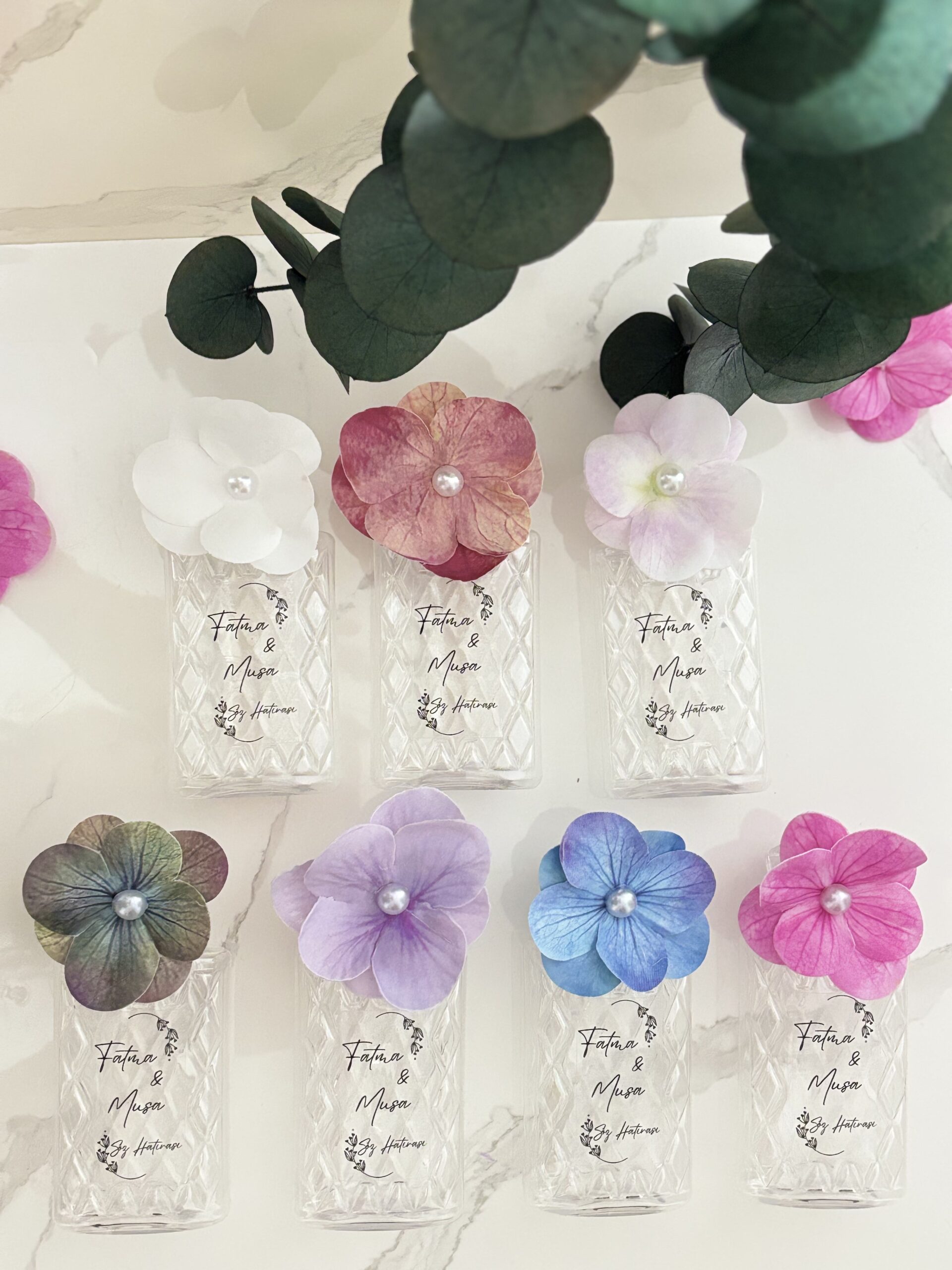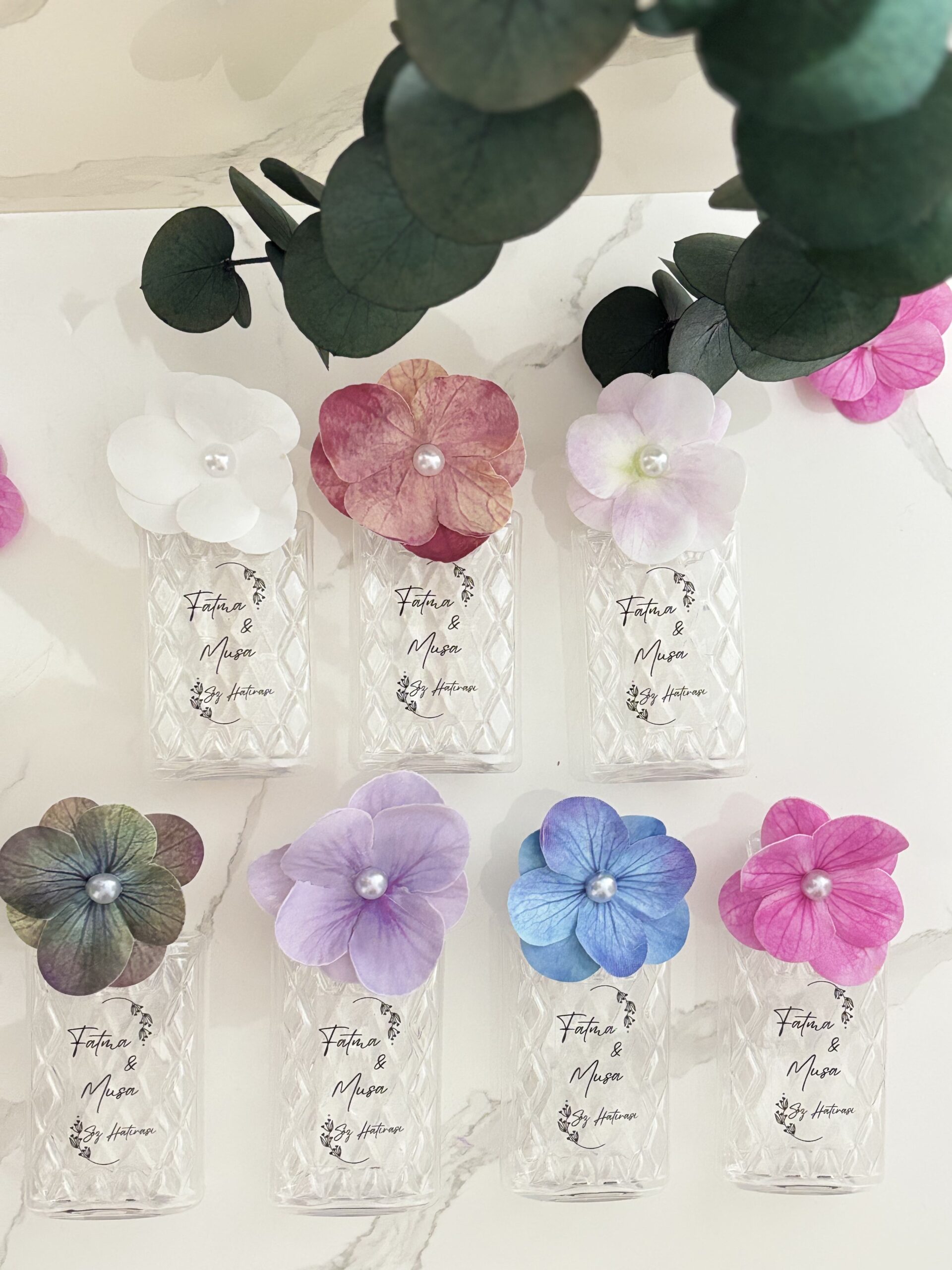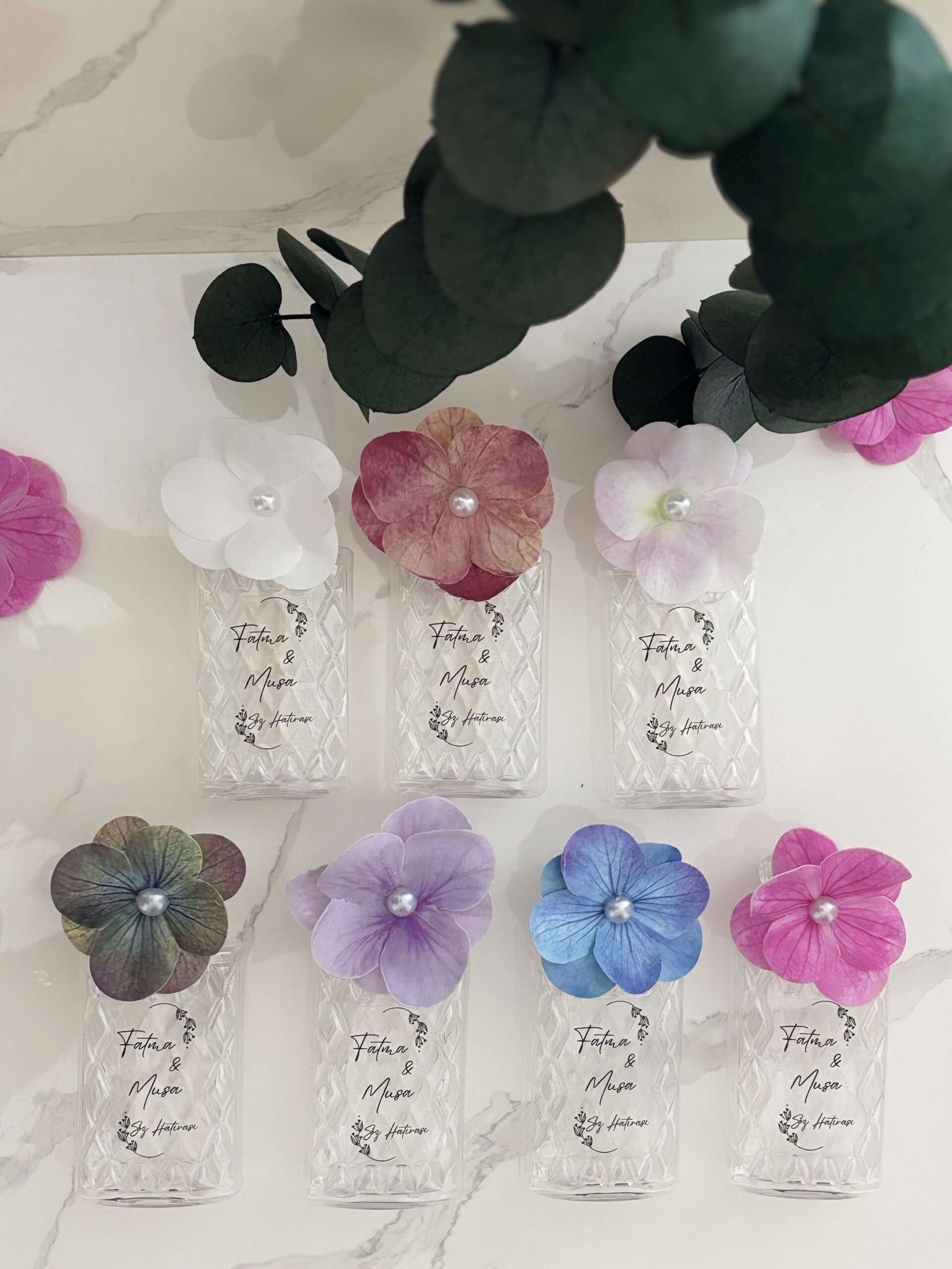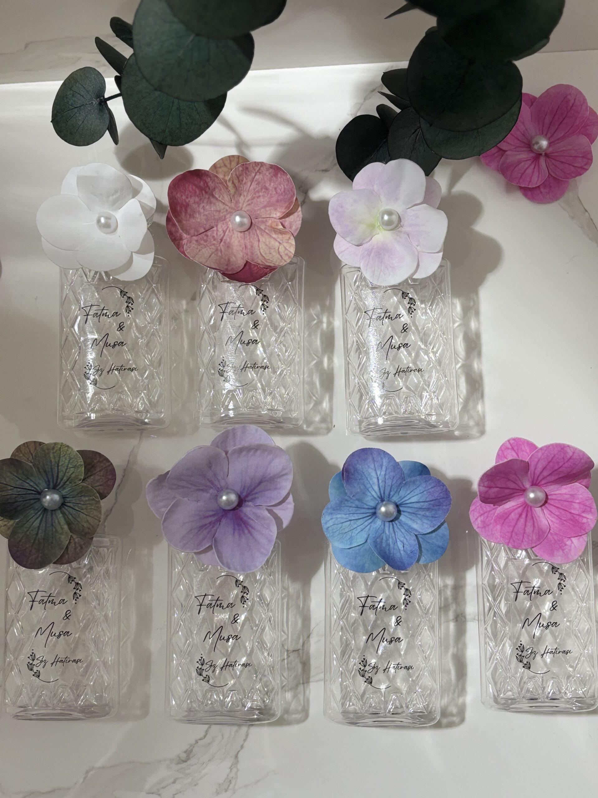 Ortanca çiçeği süslemesi ve desenli tasarımıyla öne çıkan 50cc mika şişe, özel günlerinize estetik bir dokunuş katar. Kolonya, esans, gül suyu ve benzeri sıvı kullanımına uygundur.